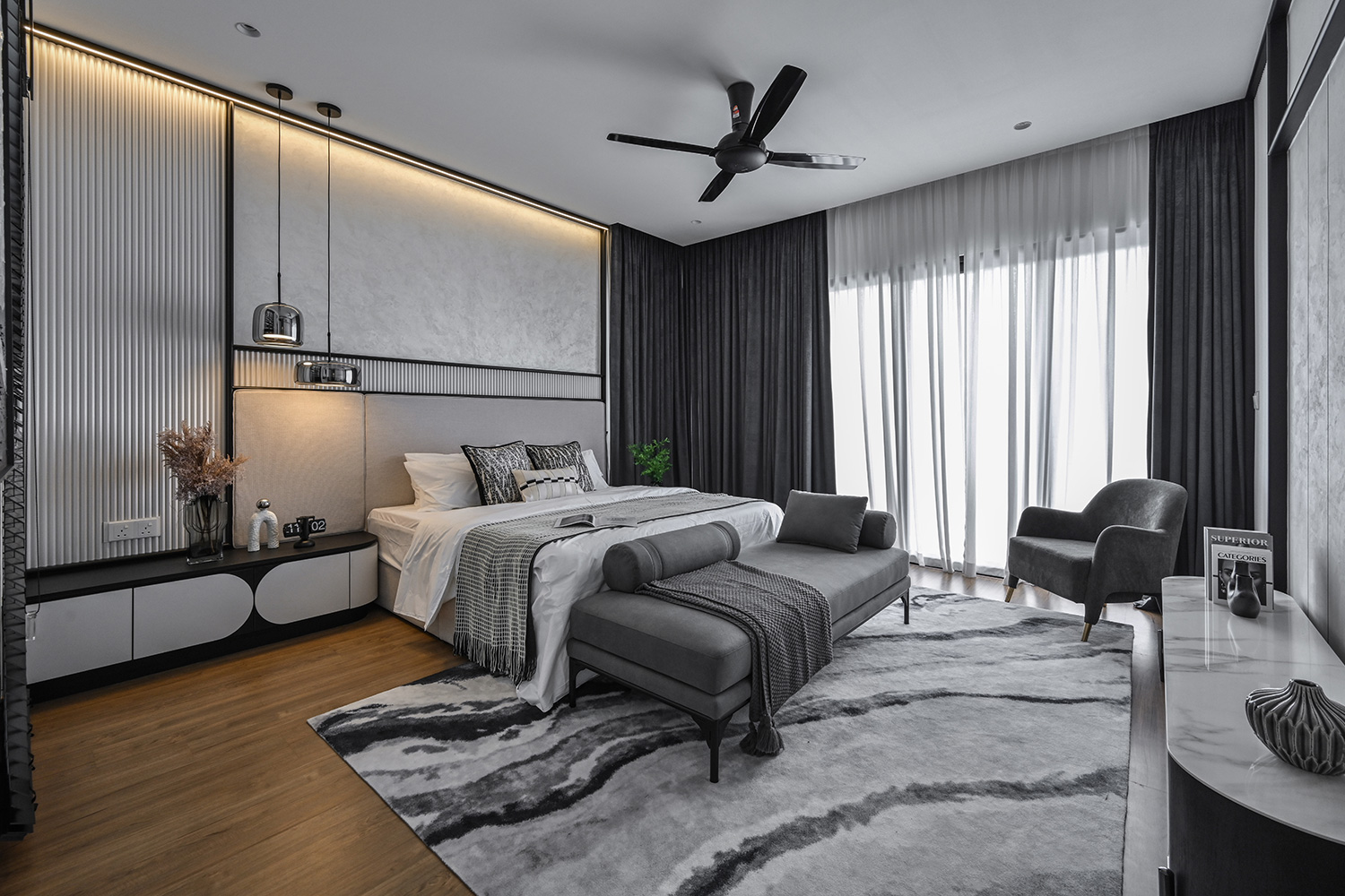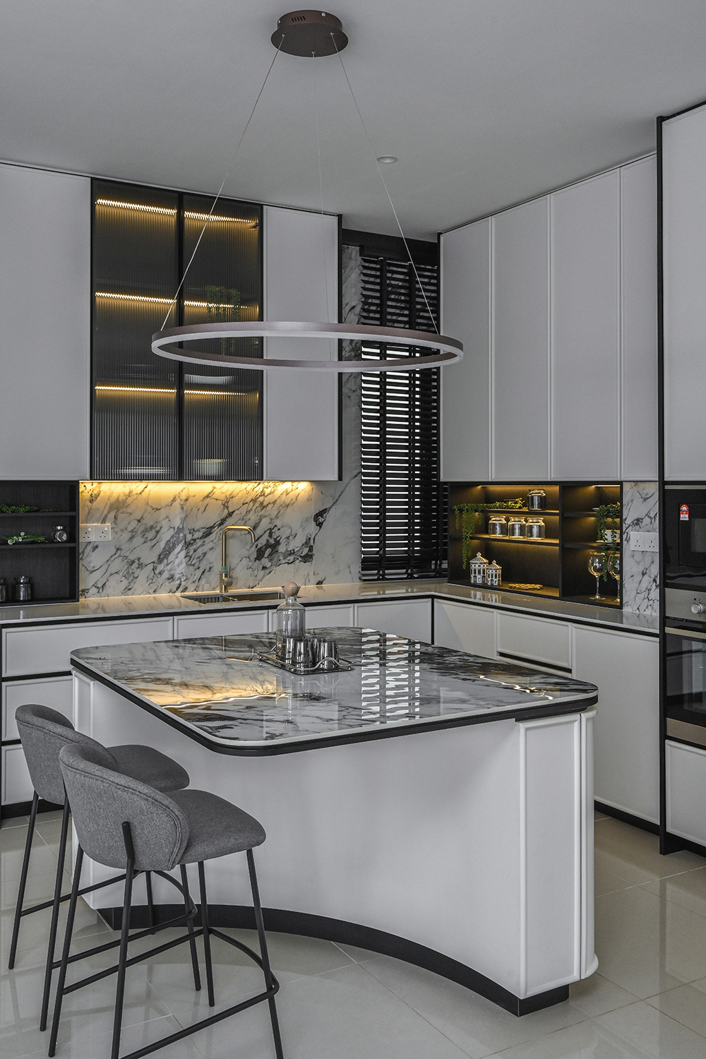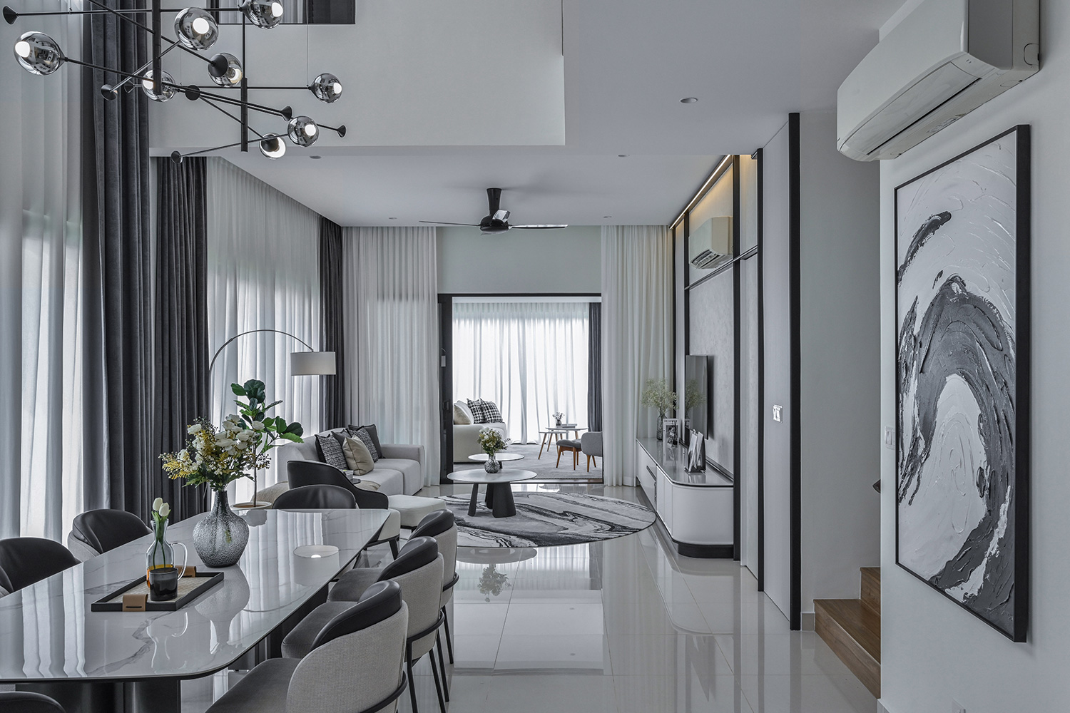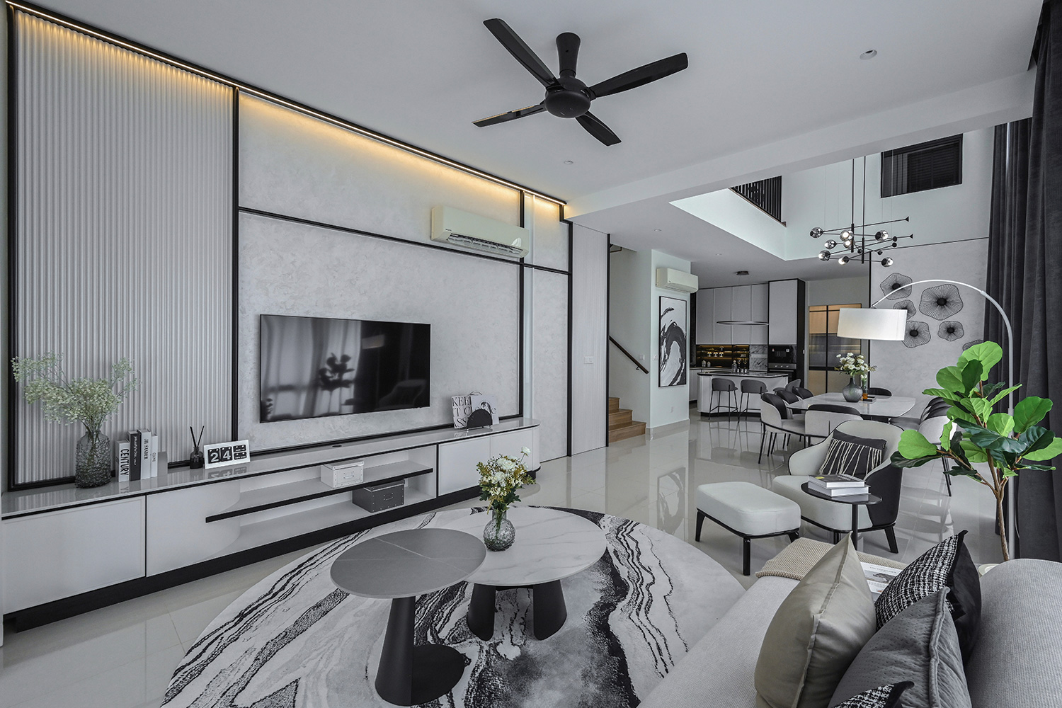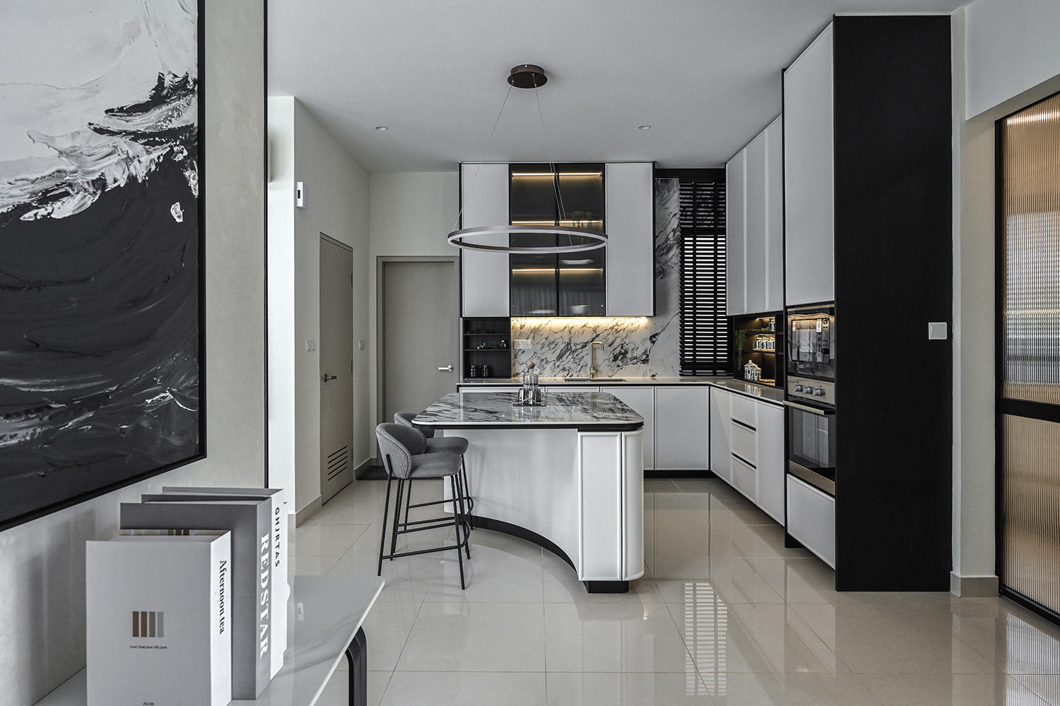The Twentyfive7 Lucent Residence Duet, located in the southern part of Kota Kemuning within a 257-acre integrated township, is designed to enhance the living experience. Featuring a detached pavilion and double-volume void area, the residence boasts a monochromatic interior palette of black, white, and gray. This color scheme is strategically varied to create a balance between minimalist simplicity and sophisticated elegance. The interplay of light and dark tones, along with the incorporation of focal points like artworks and statement furniture, adds depth and intrigue to the space. The design principles aim to achieve a harmonious and captivating atmosphere, transforming the interior into a canvas for modern living.