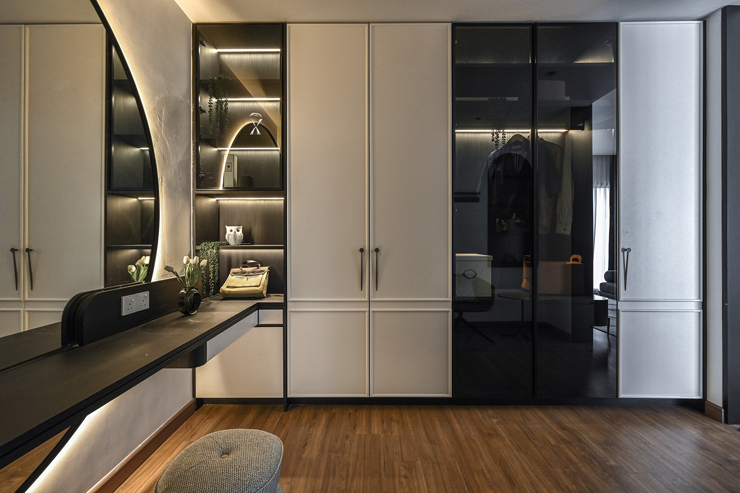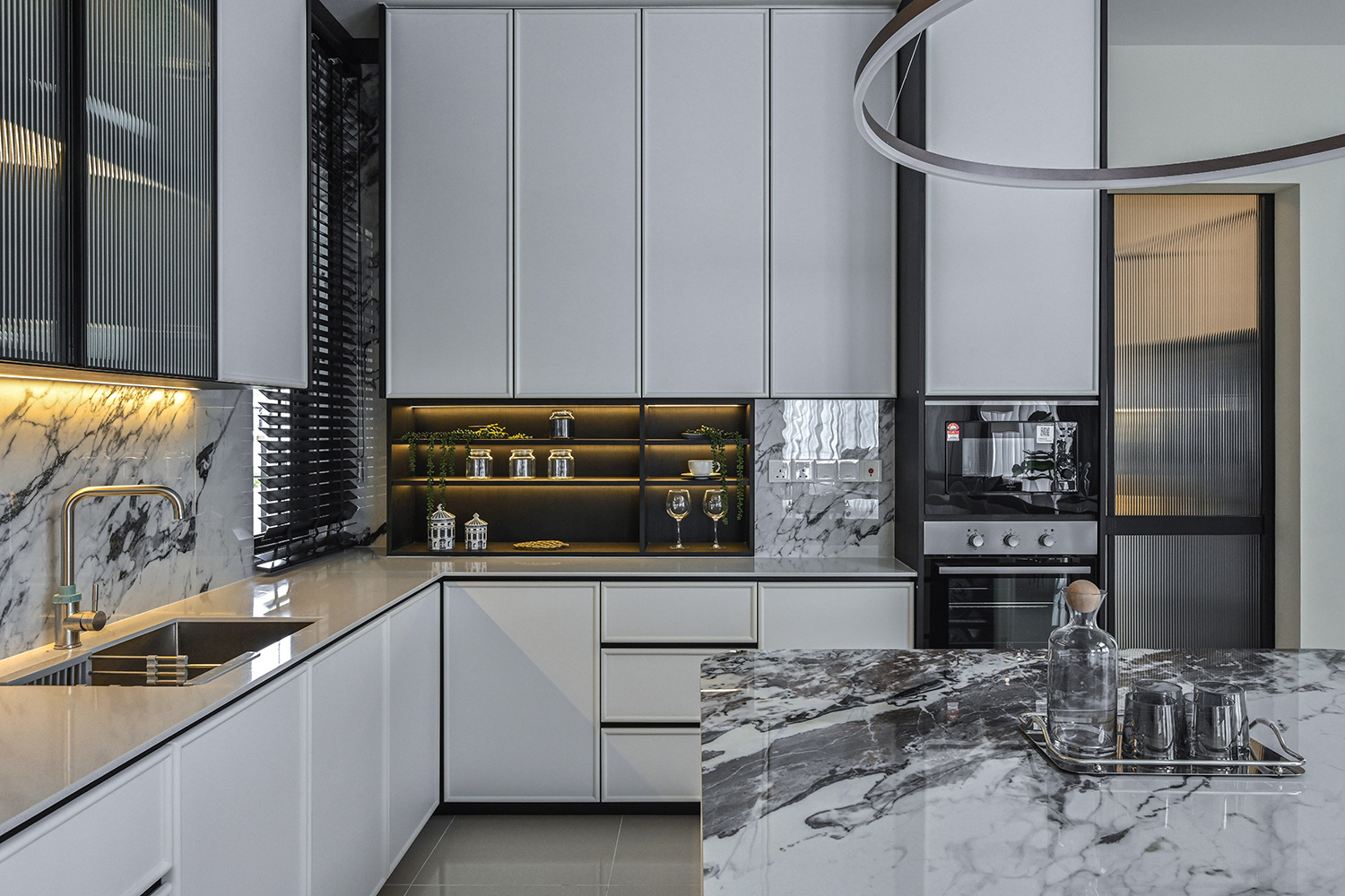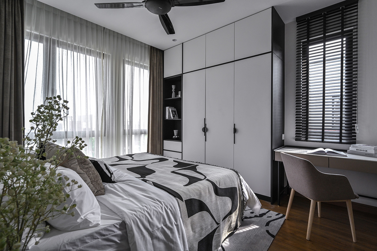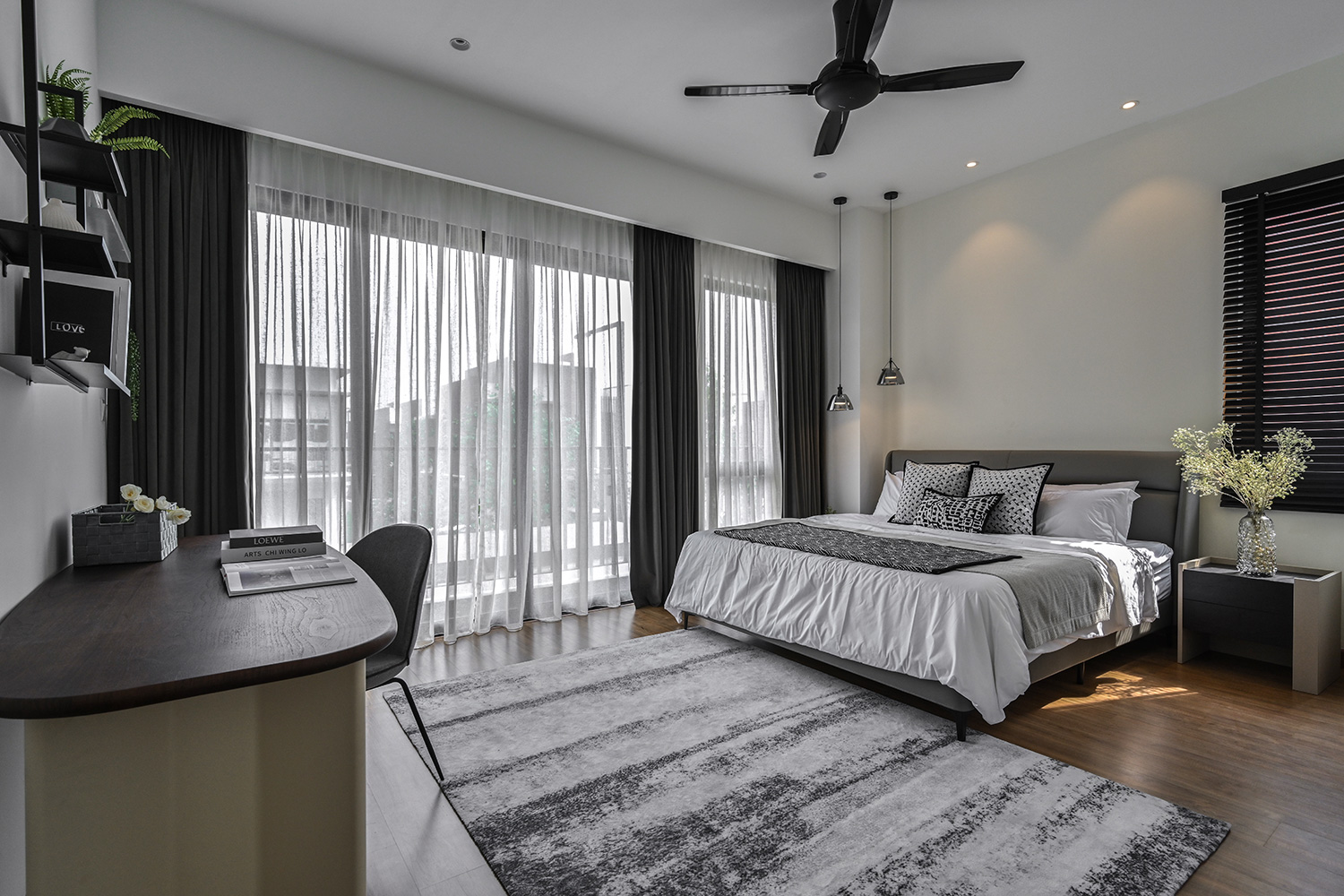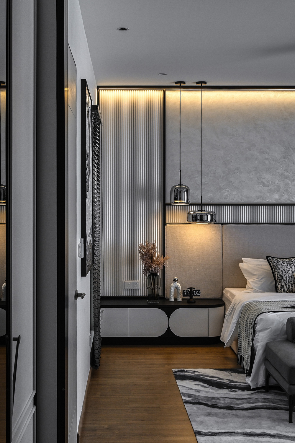 The Twentyfive7 Lucent Residence Duet, located in the southern part of Kota Kemuning within a 257-acre integrated township, is designed to enhance the living experience. Featuring a detached pavilion and double-volume void area, the residence boasts a monochromatic interior palette of black, white, and gray. This color scheme is strategically varied to create a balance between minimalist simplicity and sophisticated elegance. The interplay of light and dark tones, along with the incorporation of focal points like artworks and statement furniture, adds depth and intrigue to the space. The design principles aim to achieve a harmonious and captivating atmosphere, transforming the interior into a canvas for modern living.