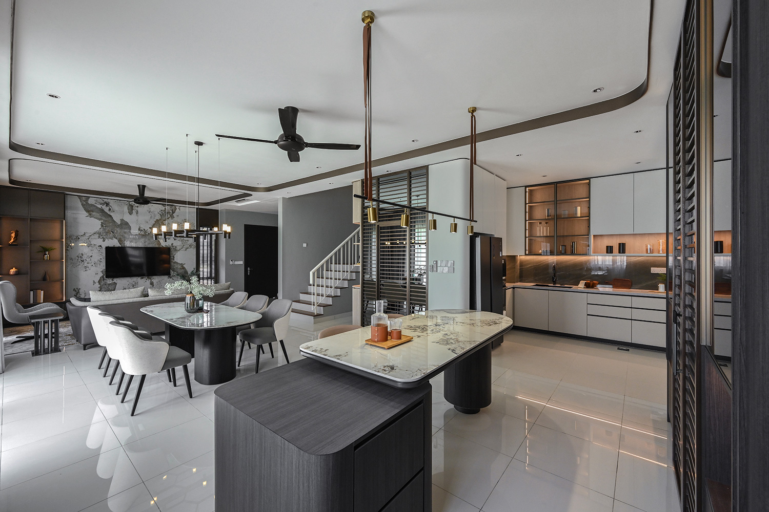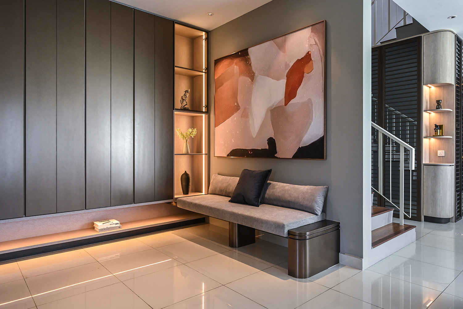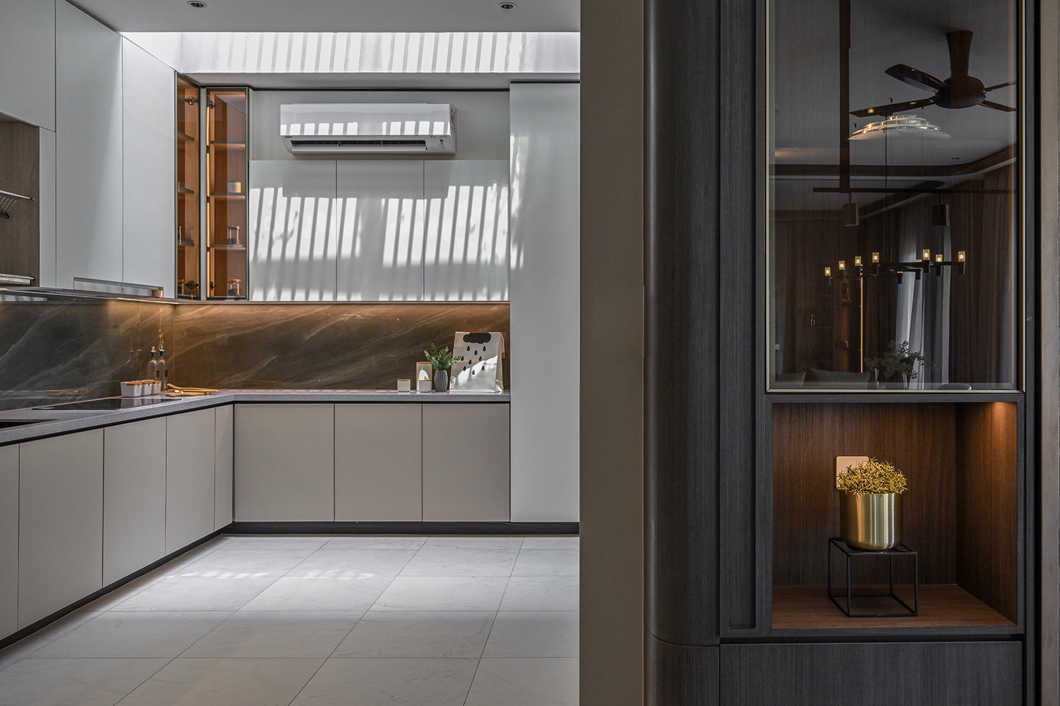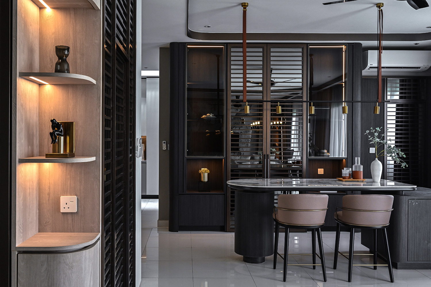 A modern yet classically inspired interior living space exudes an ambient atmosphere, featuring bronzy finishes against an ivory-toned backdrop that serves as the anchor for a luxurious, yet inviting lifestyle. The incorporation of louver motifs in various areas not only adds a distinctive feature but also seamlessly blends with the contemporary classical style, casting a captivating silhouette throughout the space.