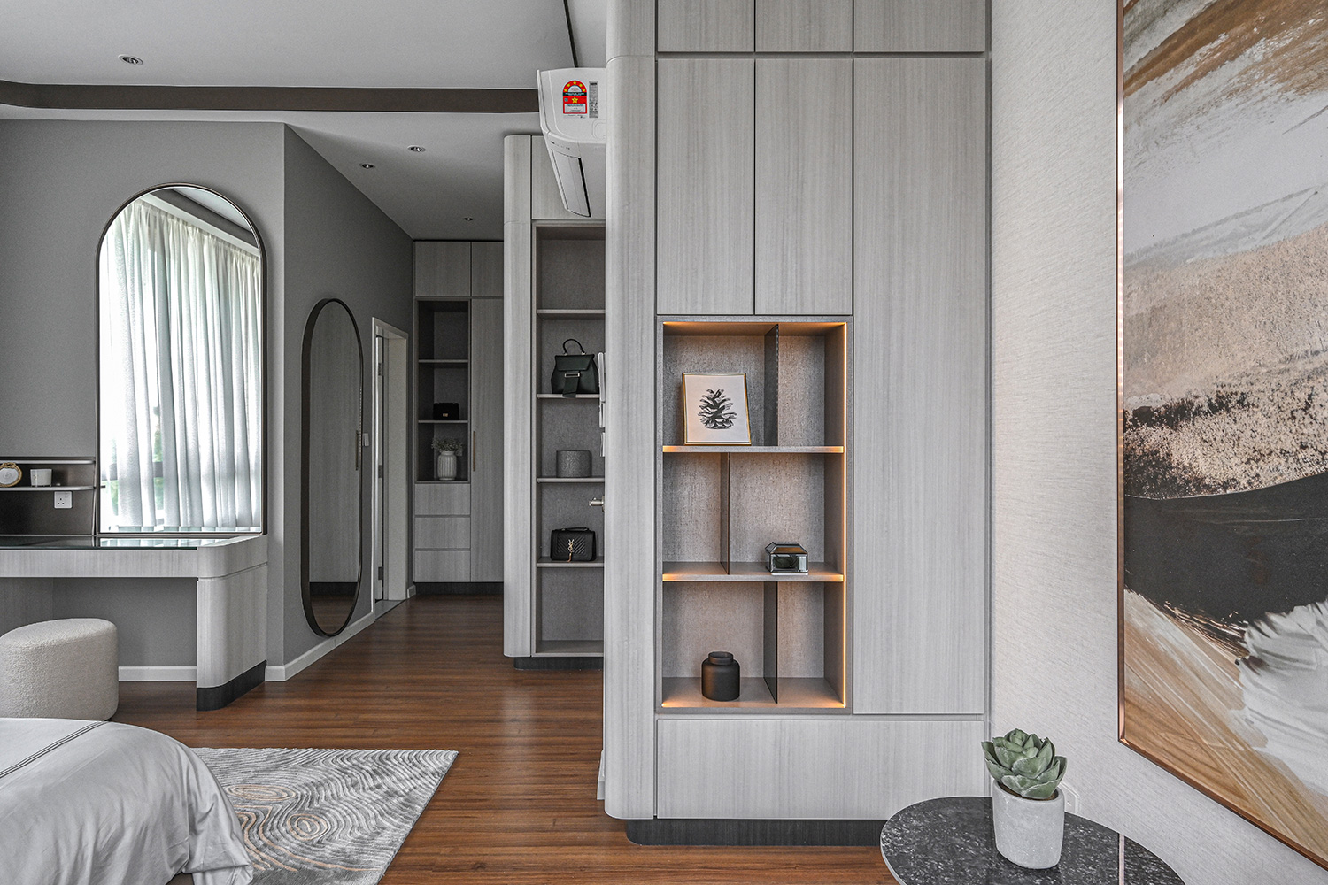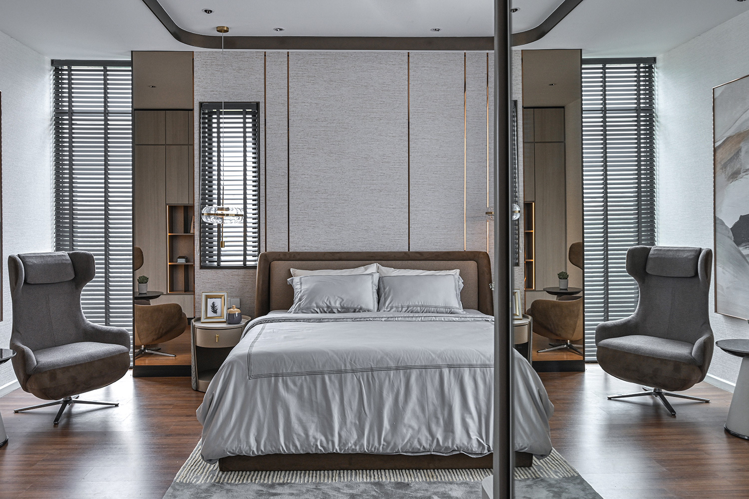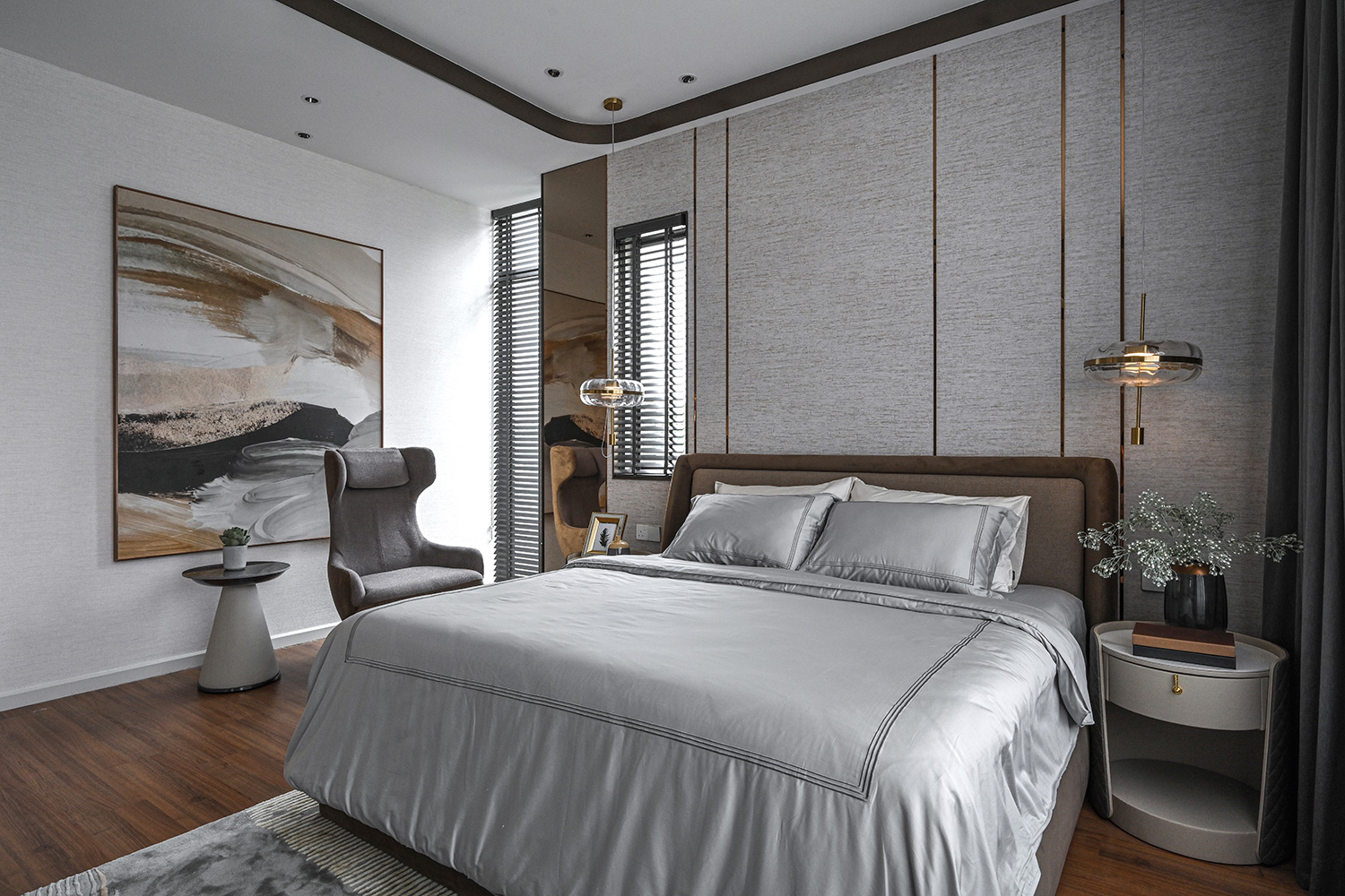 The infusion of contemporary classical elements elevates the aesthetic appeal of the interior, ensuring a timeless allure. Carefully selected loose furniture further enhances the overall ambiance, contributing to a sense of opulent living. Subtle classical details adorn the ceiling and walls, adding a touch of minimalistic sophistication that enriches the atmosphere while casting shadows that embody a premium lifestyle.