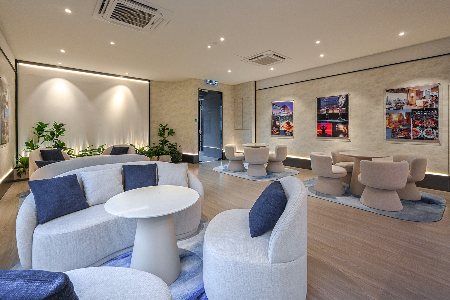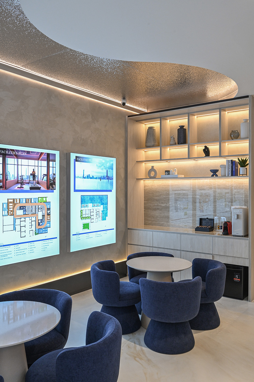 Above, the ceiling features rounded curves and fluid forms, reflecting elegance and guiding the eye across the space. Reflective ceiling finishes mimic delicate water droplets, infusing the gallery with a shimmering calmness.