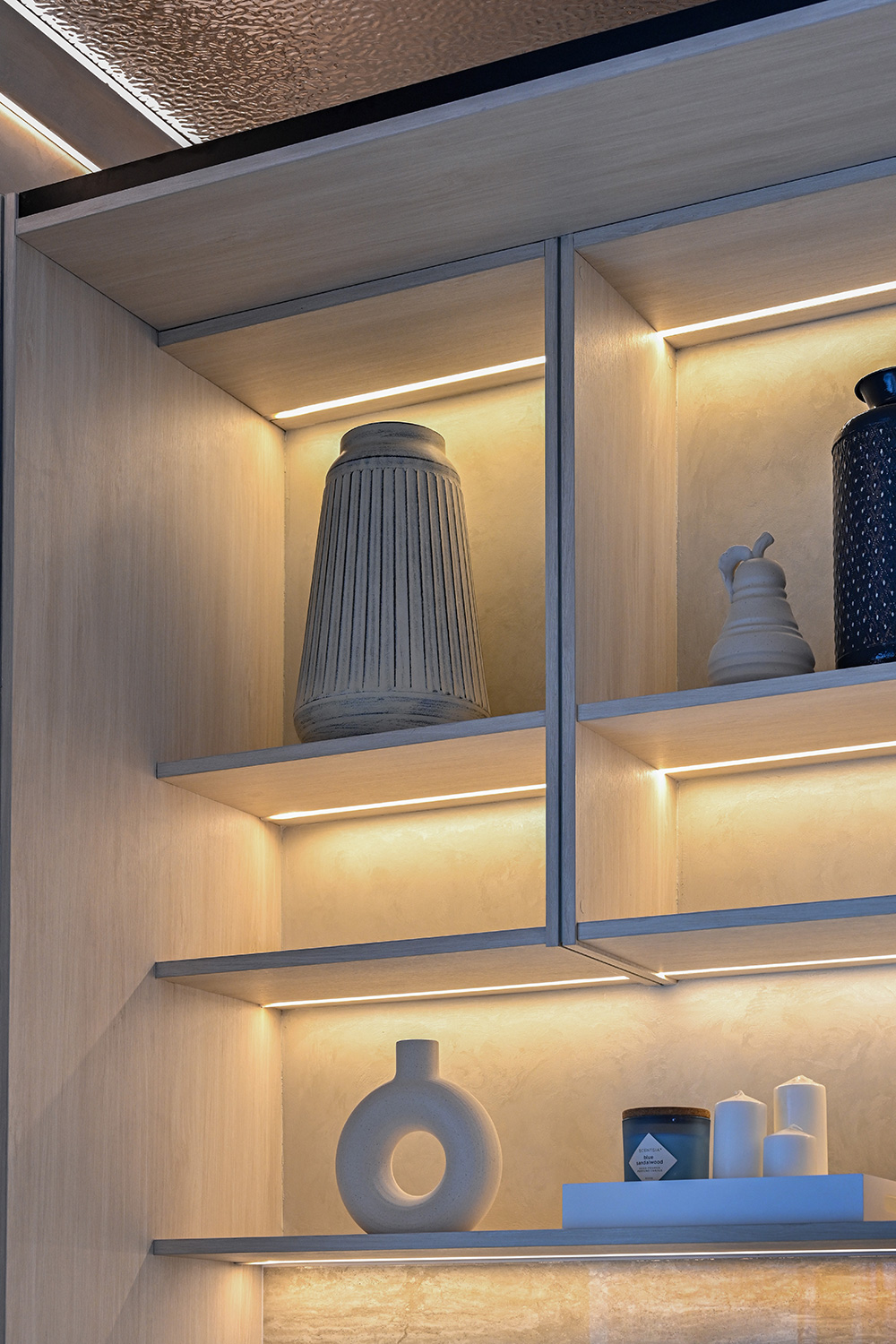 The textured walls embody contemporary style, offering visual depth through dynamic light and shadow play that enhances the gallery's understated opulence.
