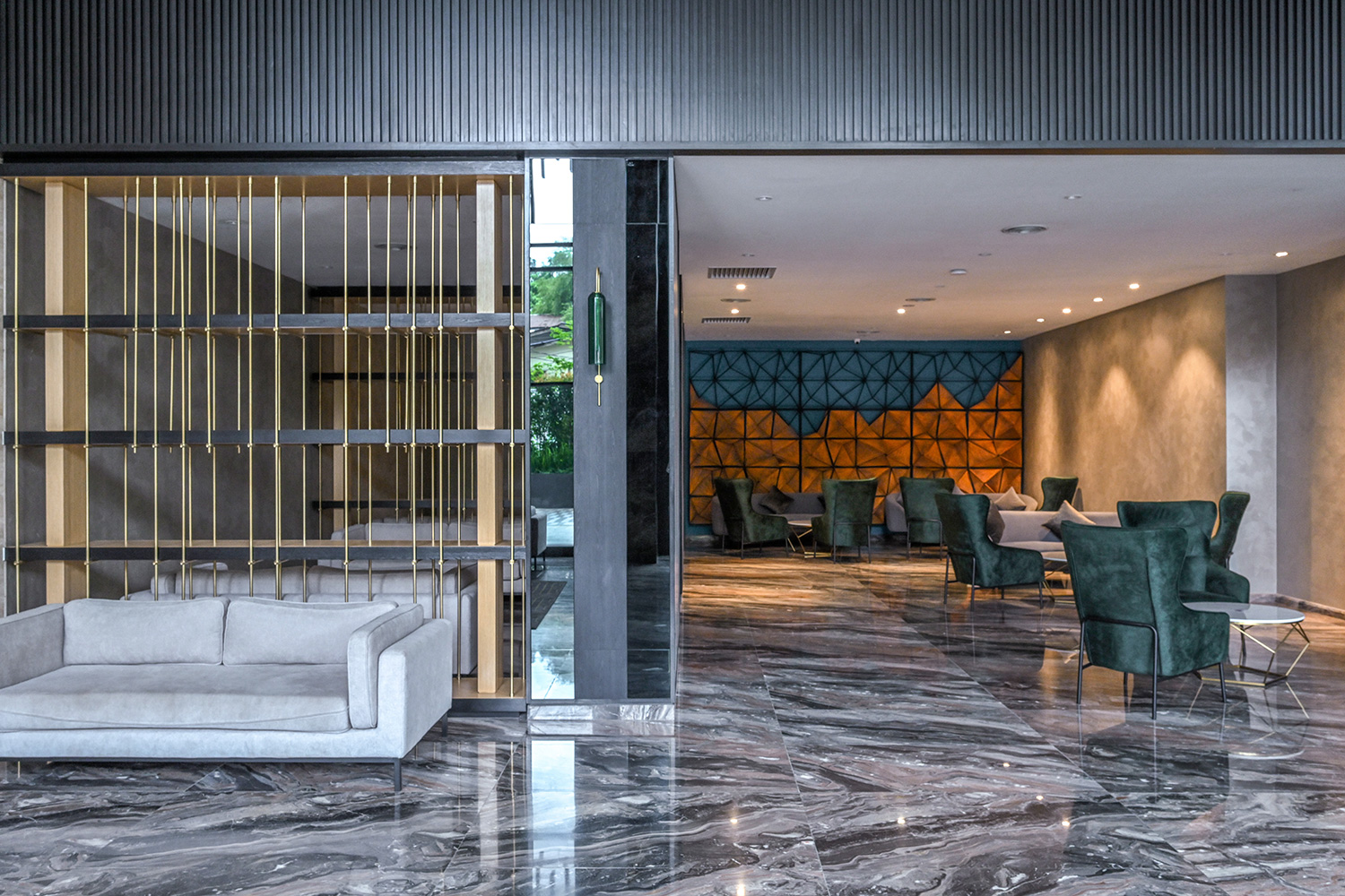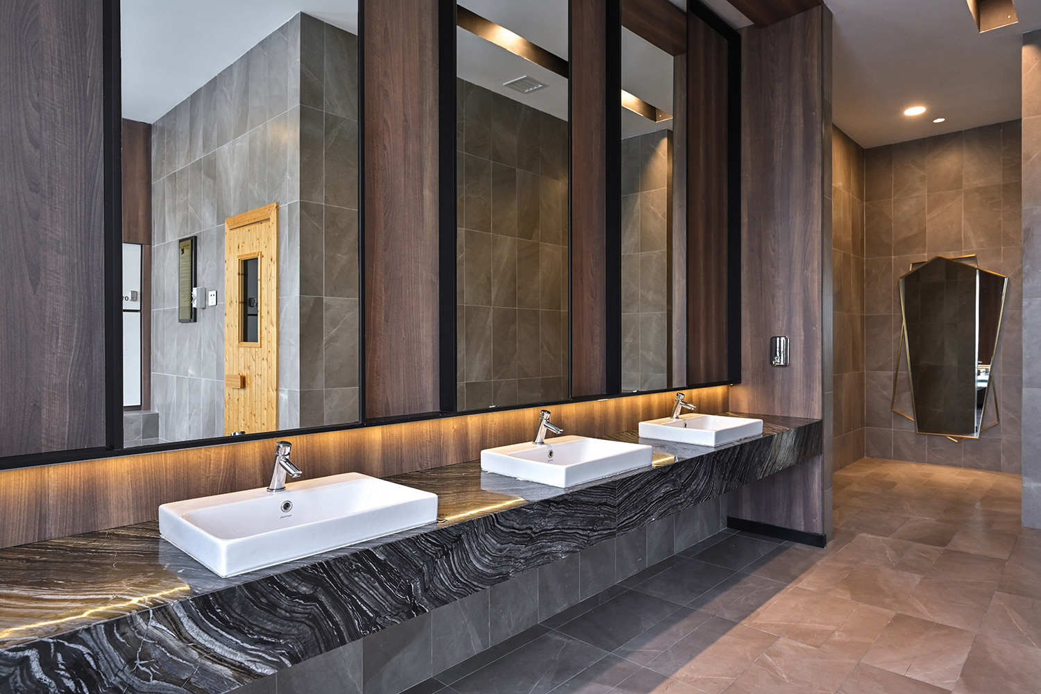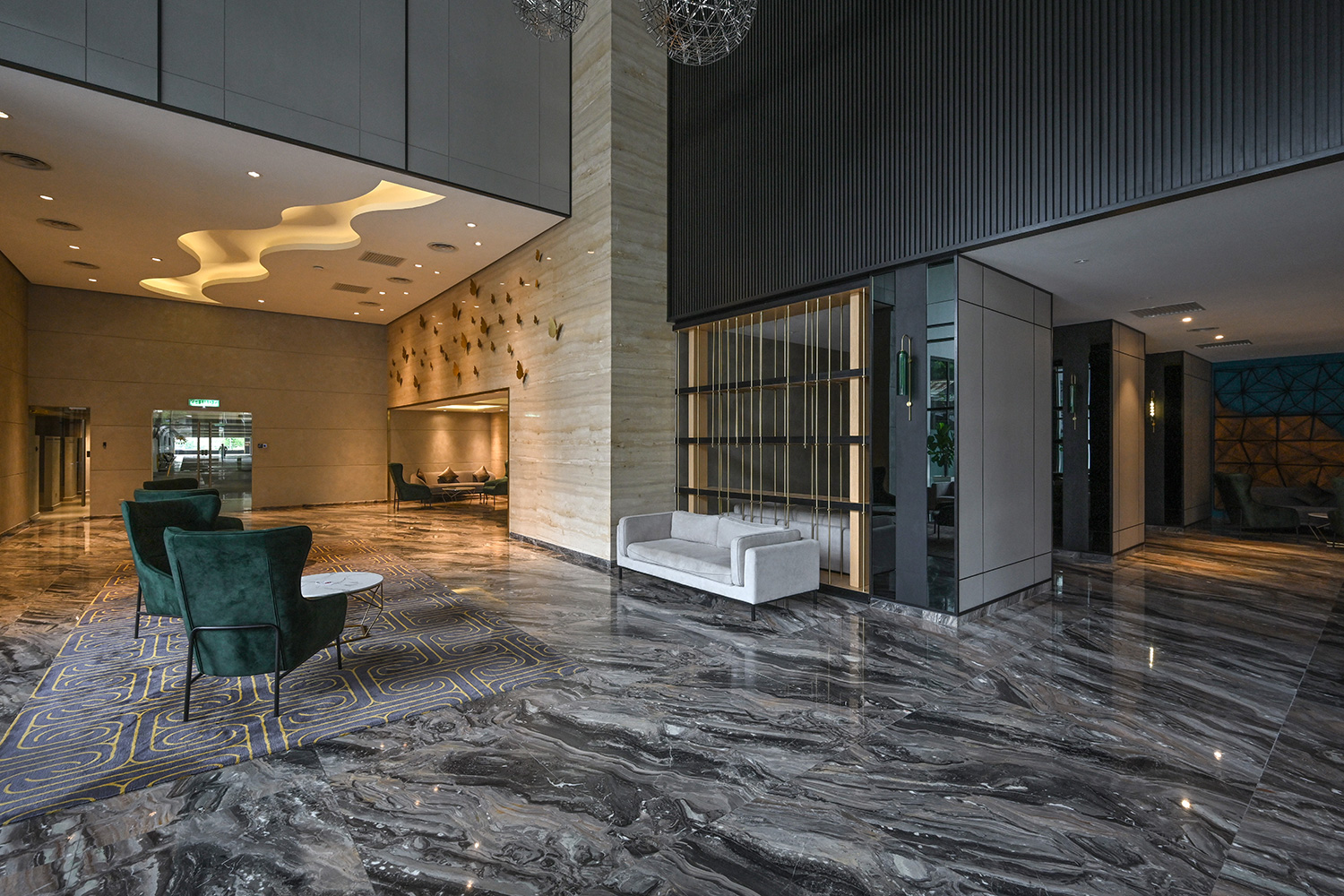 The design embraces clean architectural lines, neutral tones, and rich textures that complement the residence’s overall modern aesthetic. Premium materials, including marble-patterned flooring and warm timber accents, add depth and character, while soft ambient lighting enhances the inviting atmosphere. Every detail, from the selection of finishes to the spatial flow, is carefully curated to create refined environments where residents can relax, connect, and enjoy an elevated living experience.